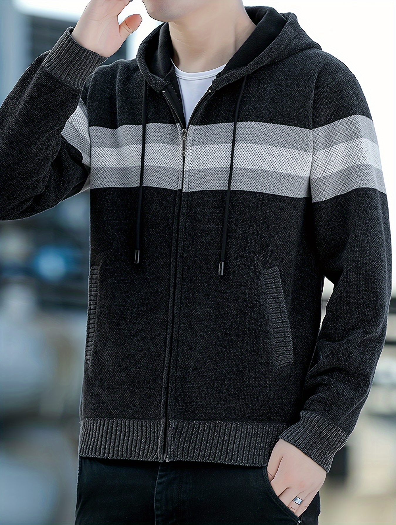 1pc Men'S Casual Color Block Chenille Hooded Knit Jacket - Polyester Long Sleeve Zip-Up with Slight Stretch, Regular Fit Hooded Sweater for Fall/Winter