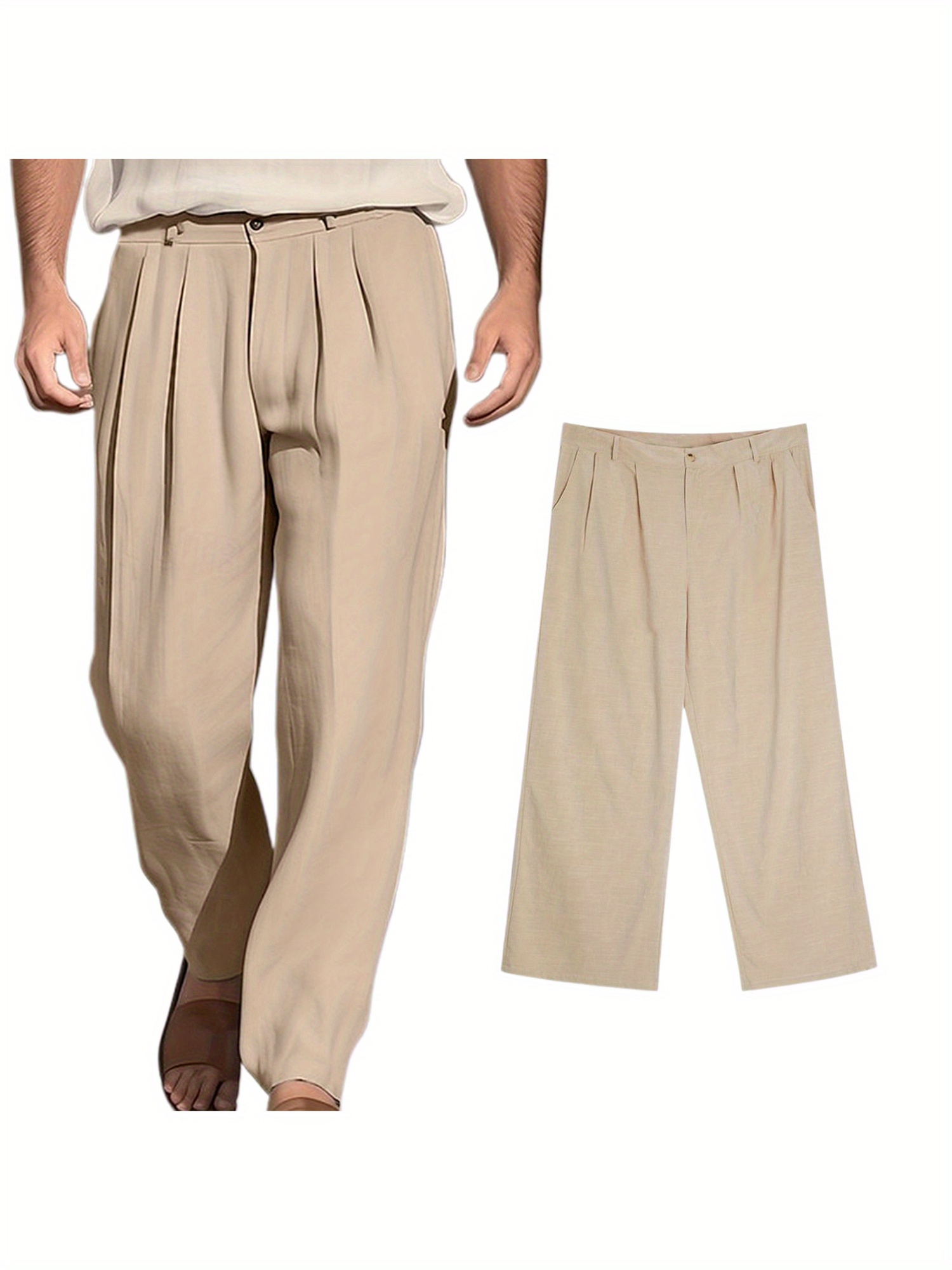 1pc Men'S Casual Wide Leg Pants - Cotton Blend, Solid Color, All-Season, Regular Fit, Slight Stretch, Woven Fabric, Mid Waist with Drawstring and Pleated Front - Versatile for Beach and Daily Wear