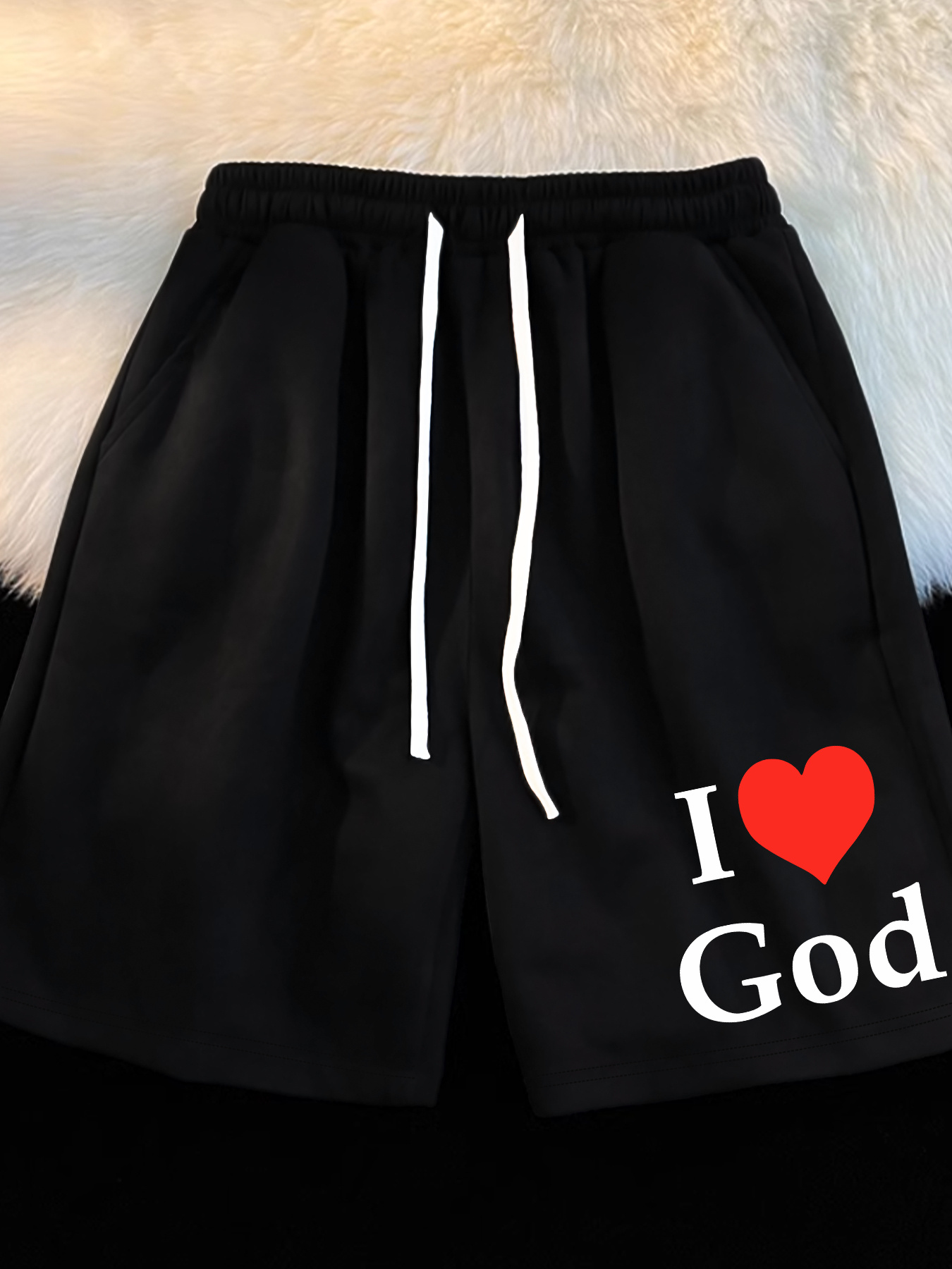 Casual Polyester Knit Fabric Shorts with Pockets, Regular Fit, Slight Stretch, Alphabet Pattern, with "I ♥ God" Print for God