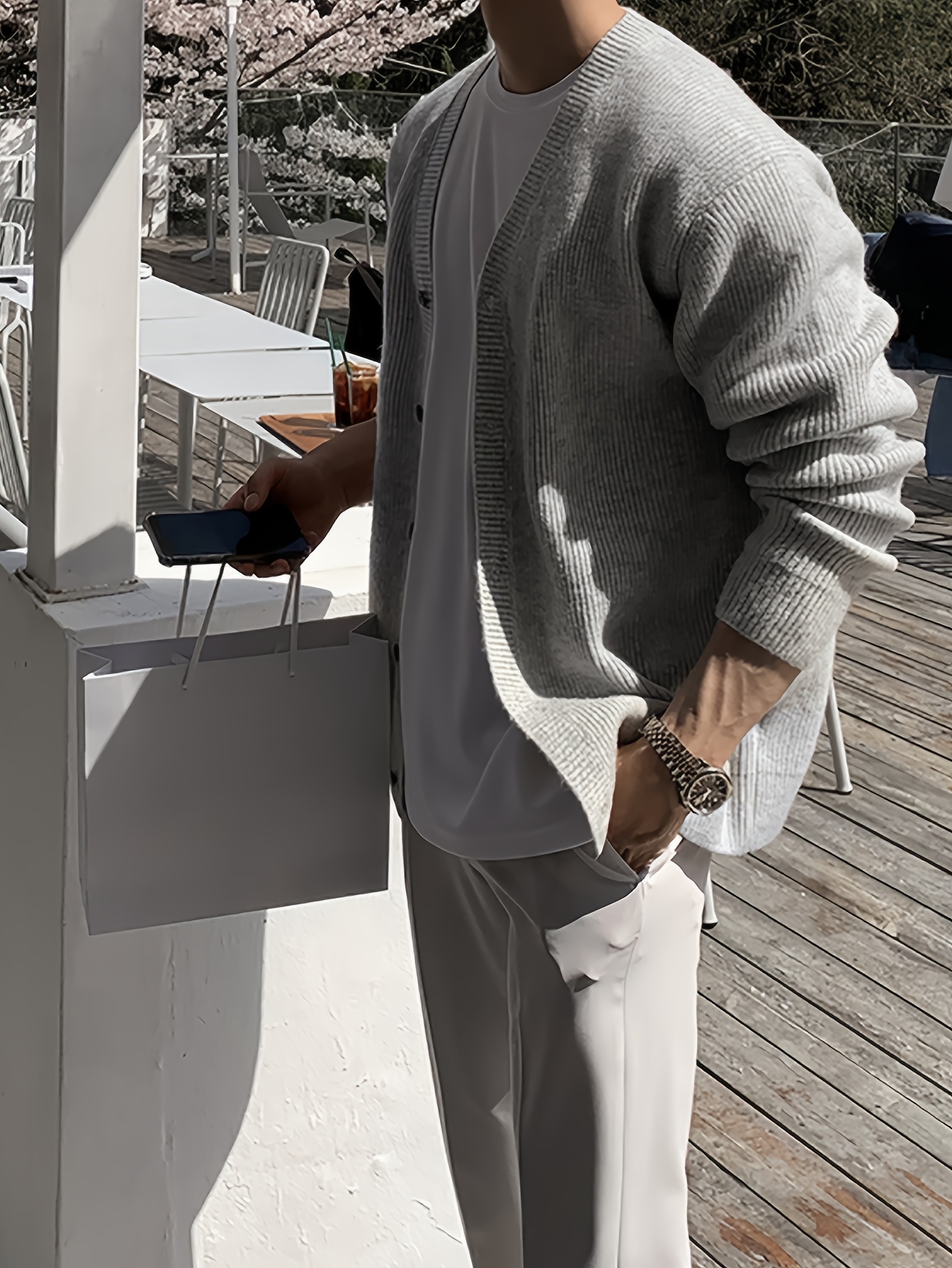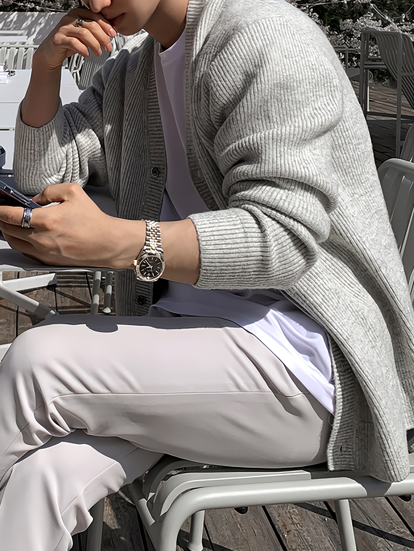 Men'S Casual V-Neck Cardigan, Polyester Knit Fabric, Solid Color, Long Sleeve, Loose Fit, with Button Detail, for Fall/Winter Collection