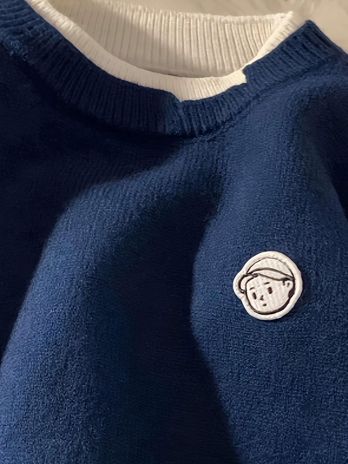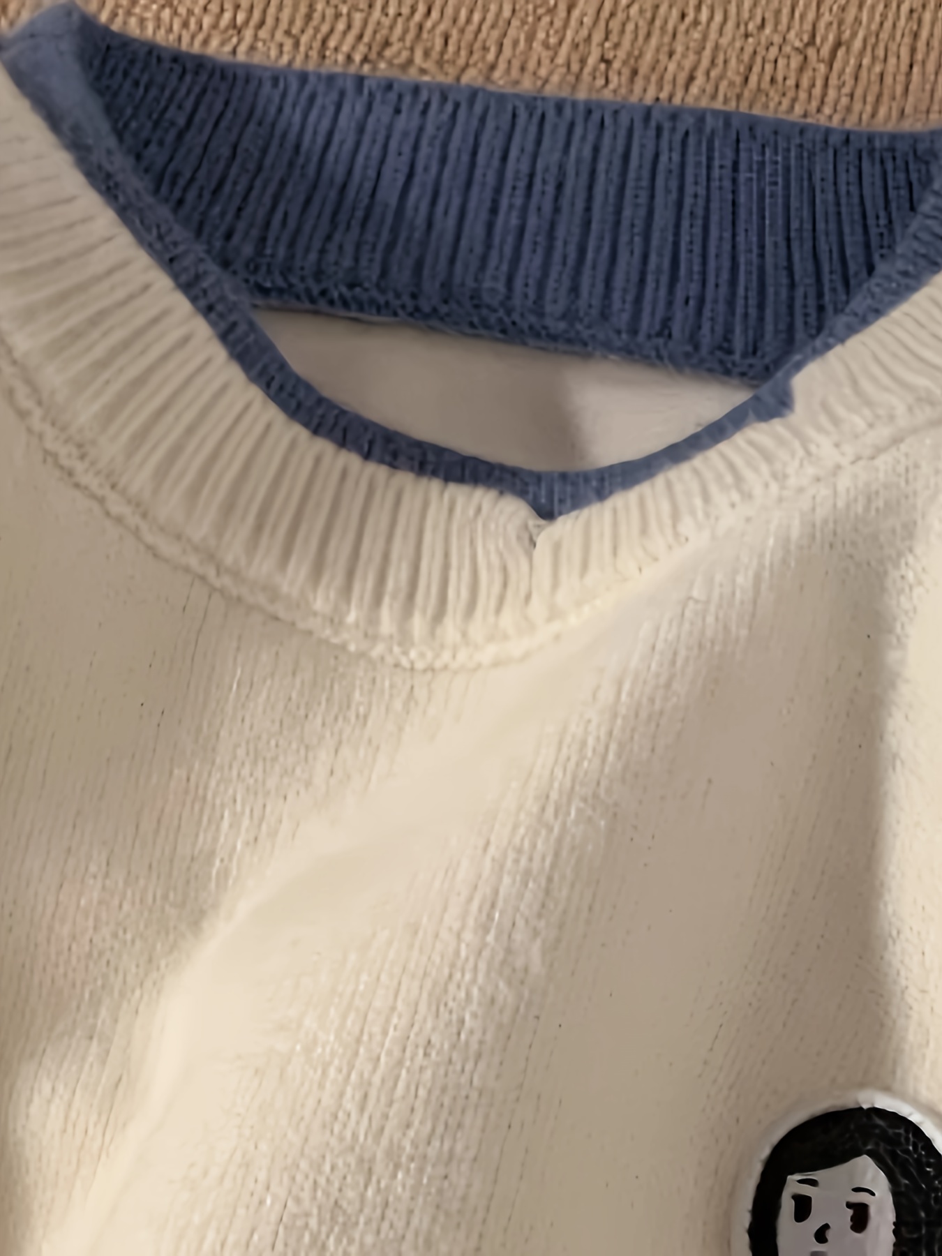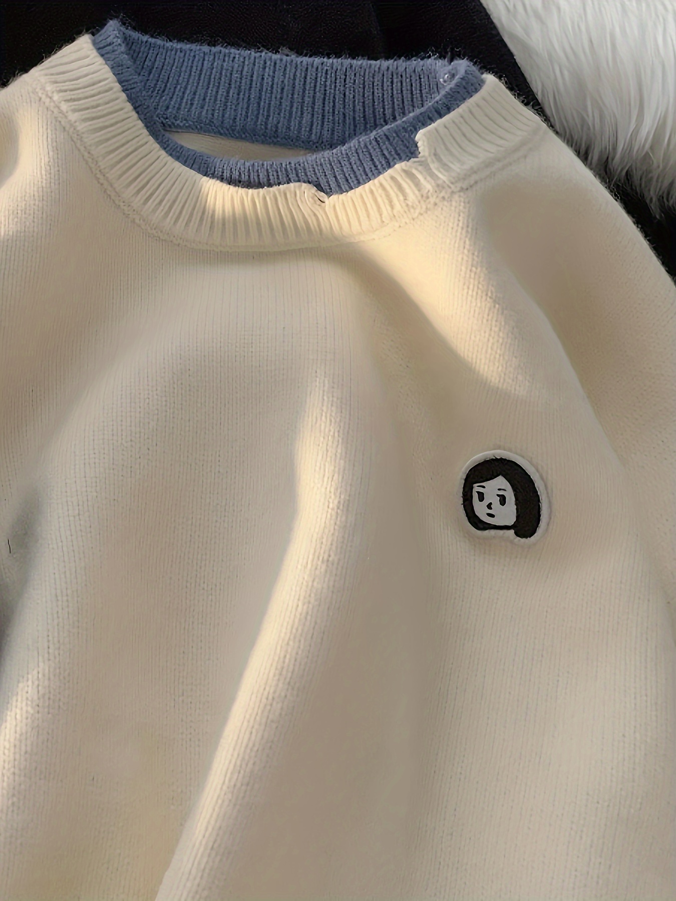 Men's Loose Color Block Cute Boy Graphic Print Fake Two-piece Knitted Pullover, Casual Long Sleeve Crew Neck Sweater For Fall
