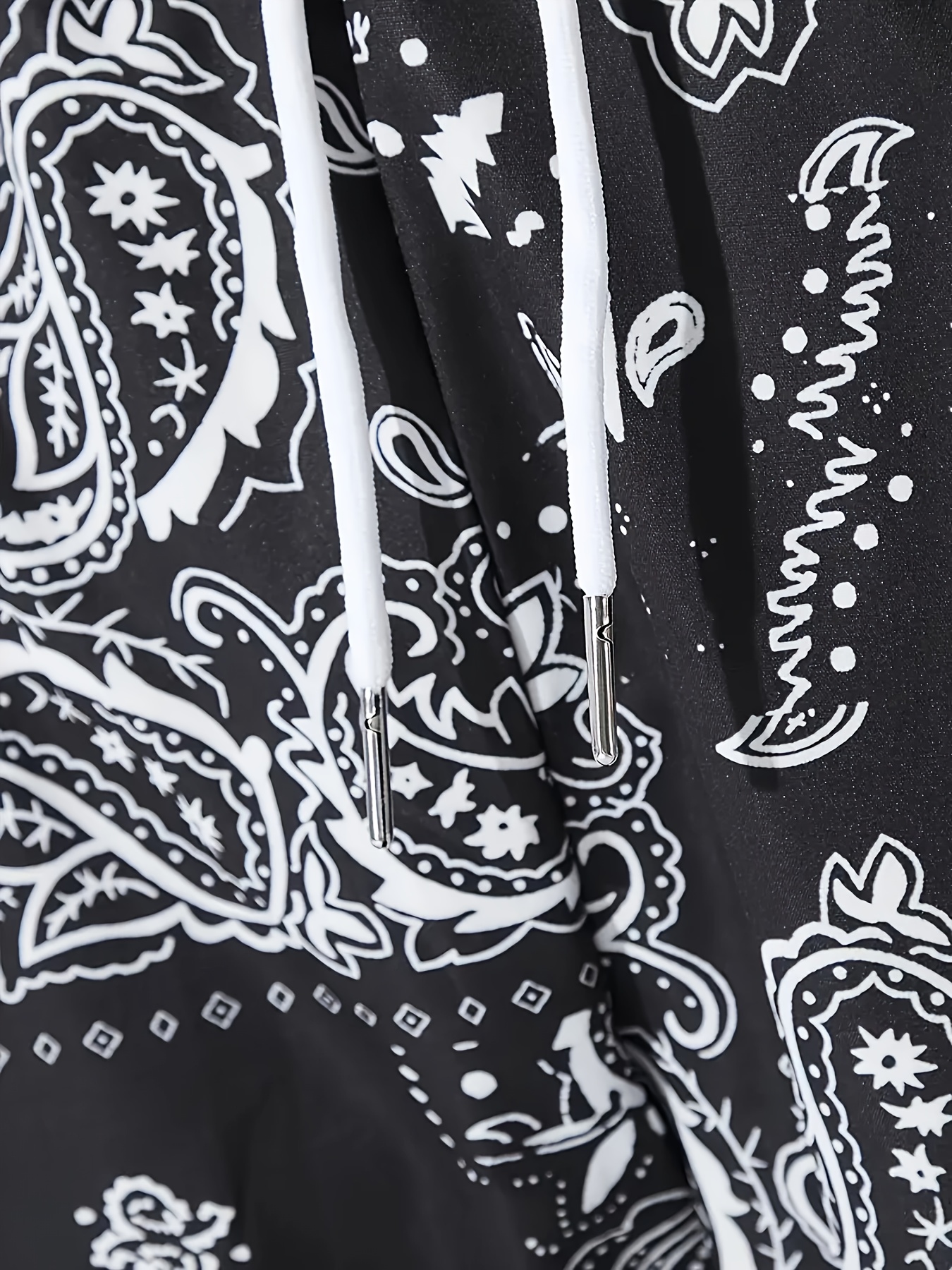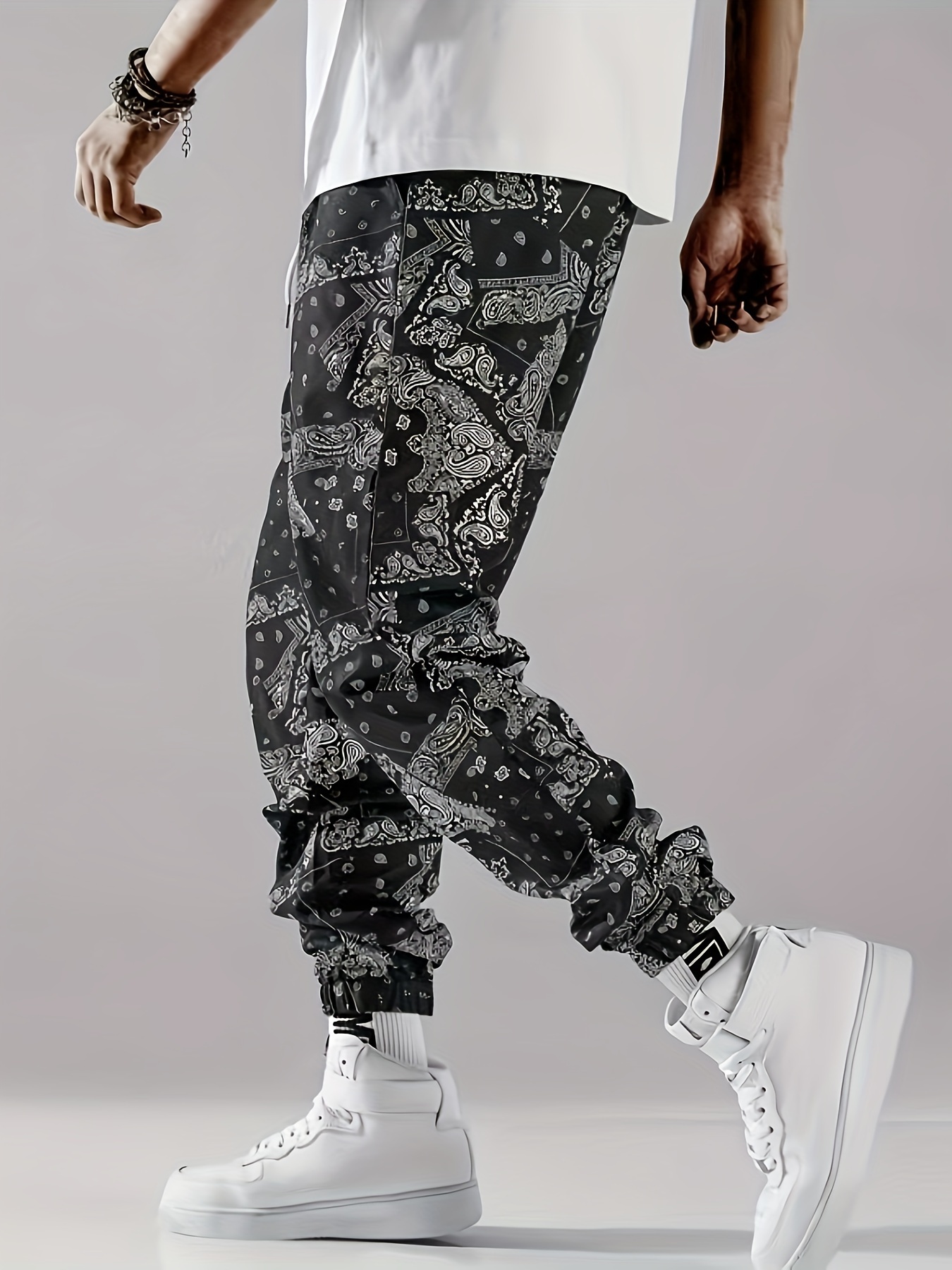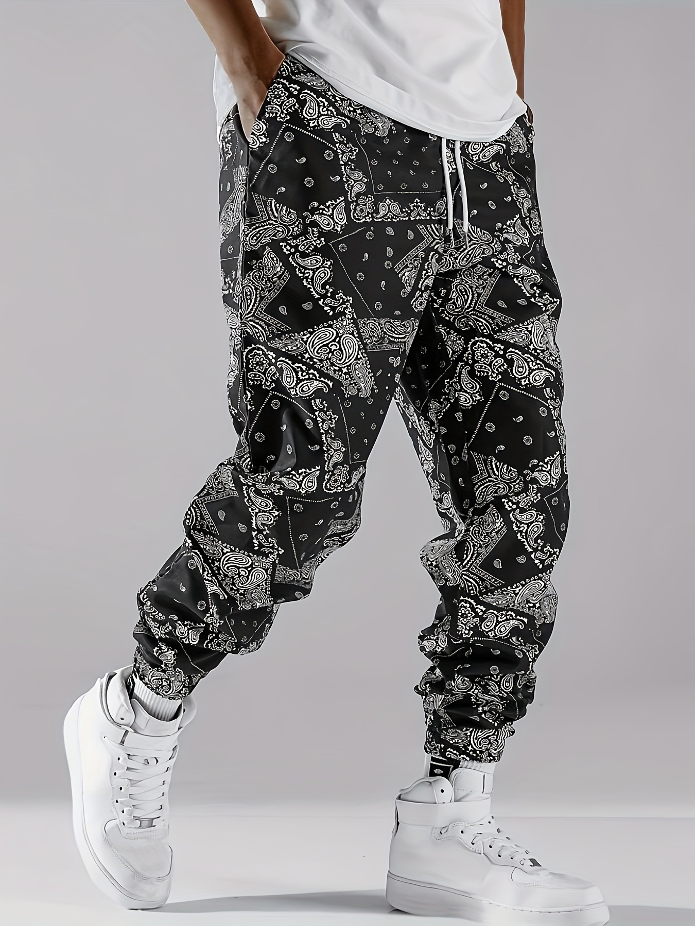 Stylish Paisley Print, Men's Casual Cuffed Pants, Breathable Lightweight Comfy Drawstring Pants