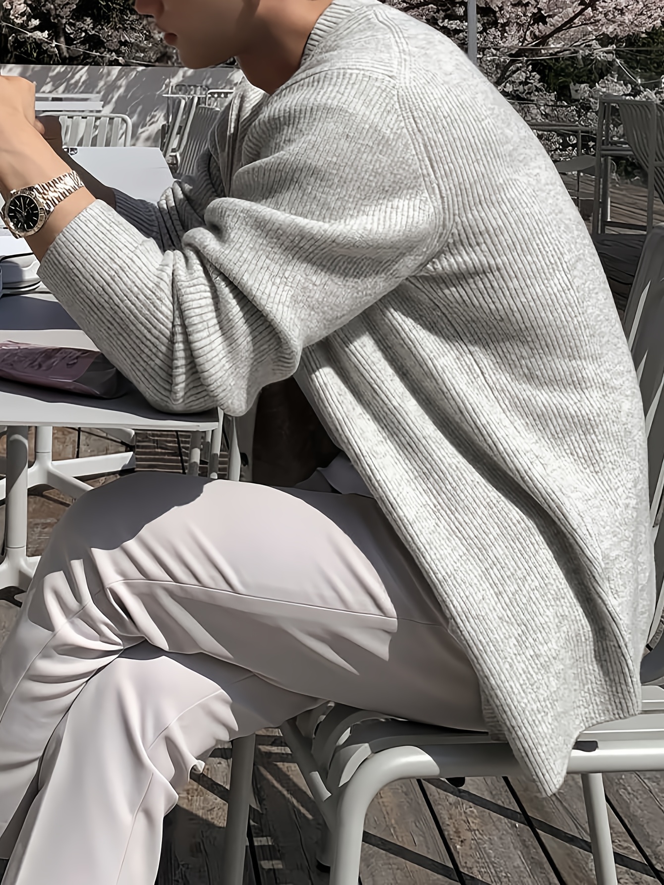 Men'S Casual V-Neck Cardigan, Polyester Knit Fabric, Solid Color, Long Sleeve, Loose Fit, with Button Detail, for Fall/Winter Collection