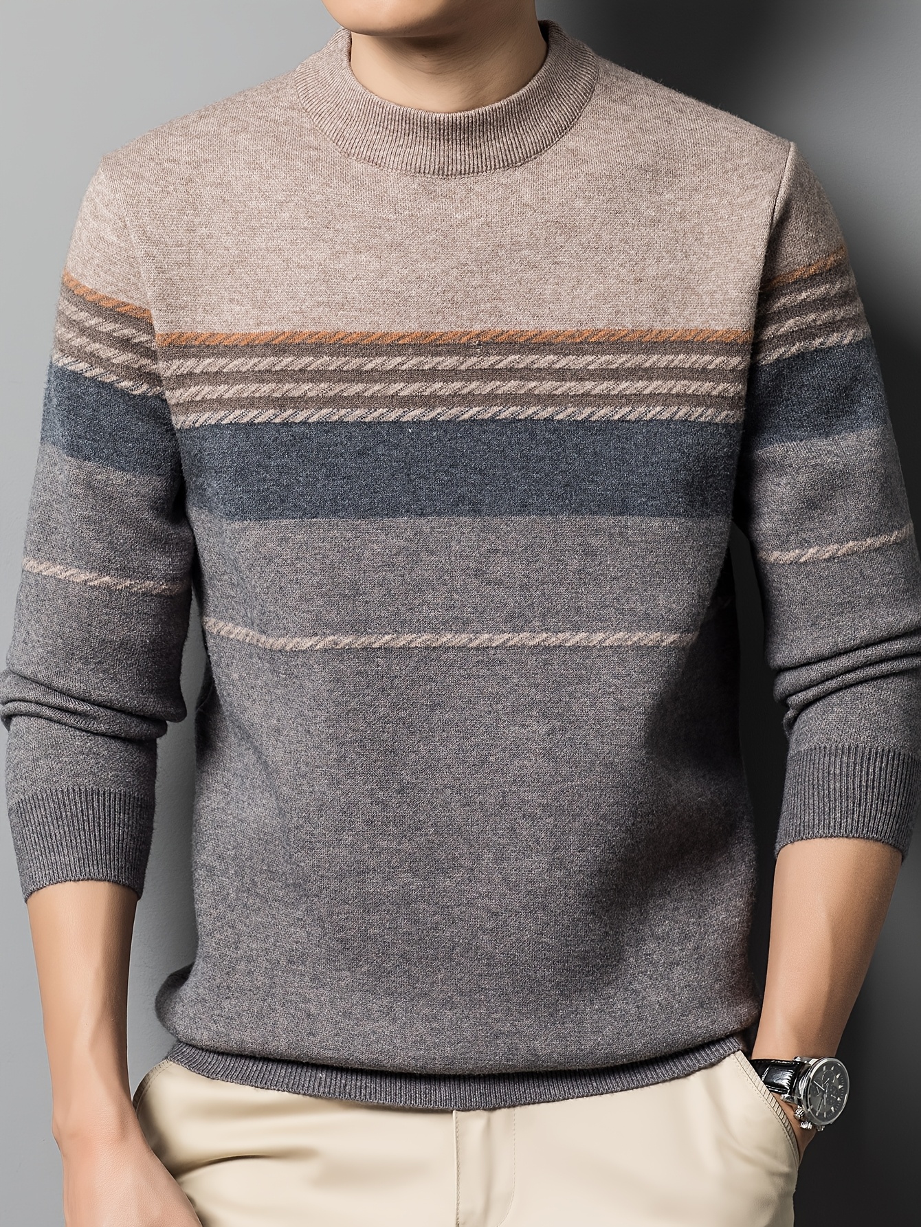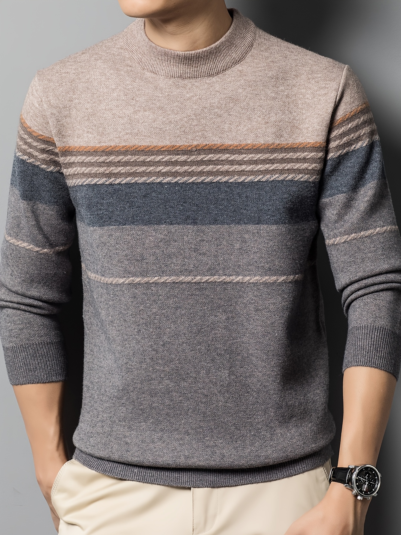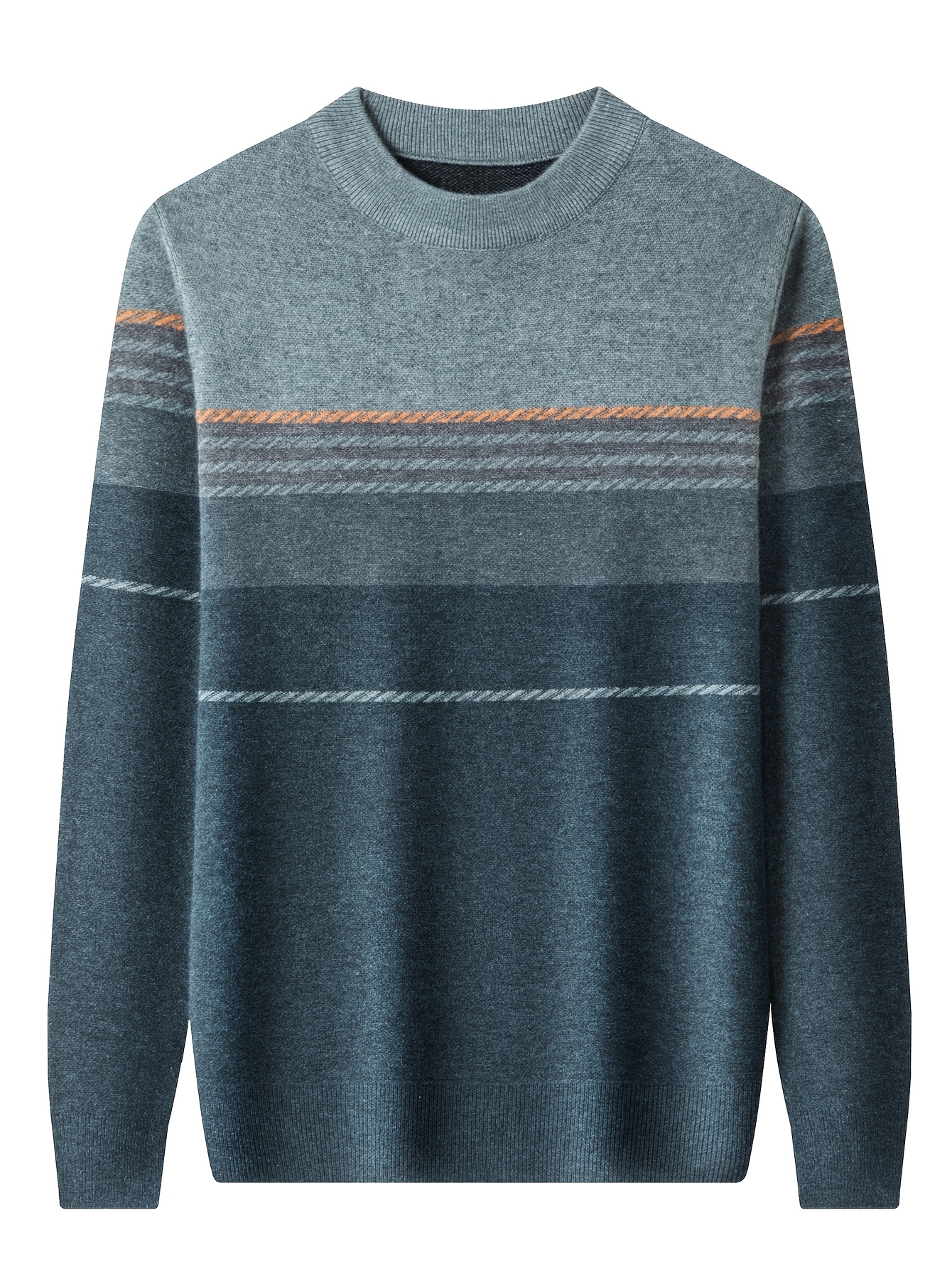 1pc Men'S Casual Striped Crew Neck Sweater, Polyester Knit Long Sleeve Pullover, Mature Style Solid Color Warm Top for Sports and Leisure