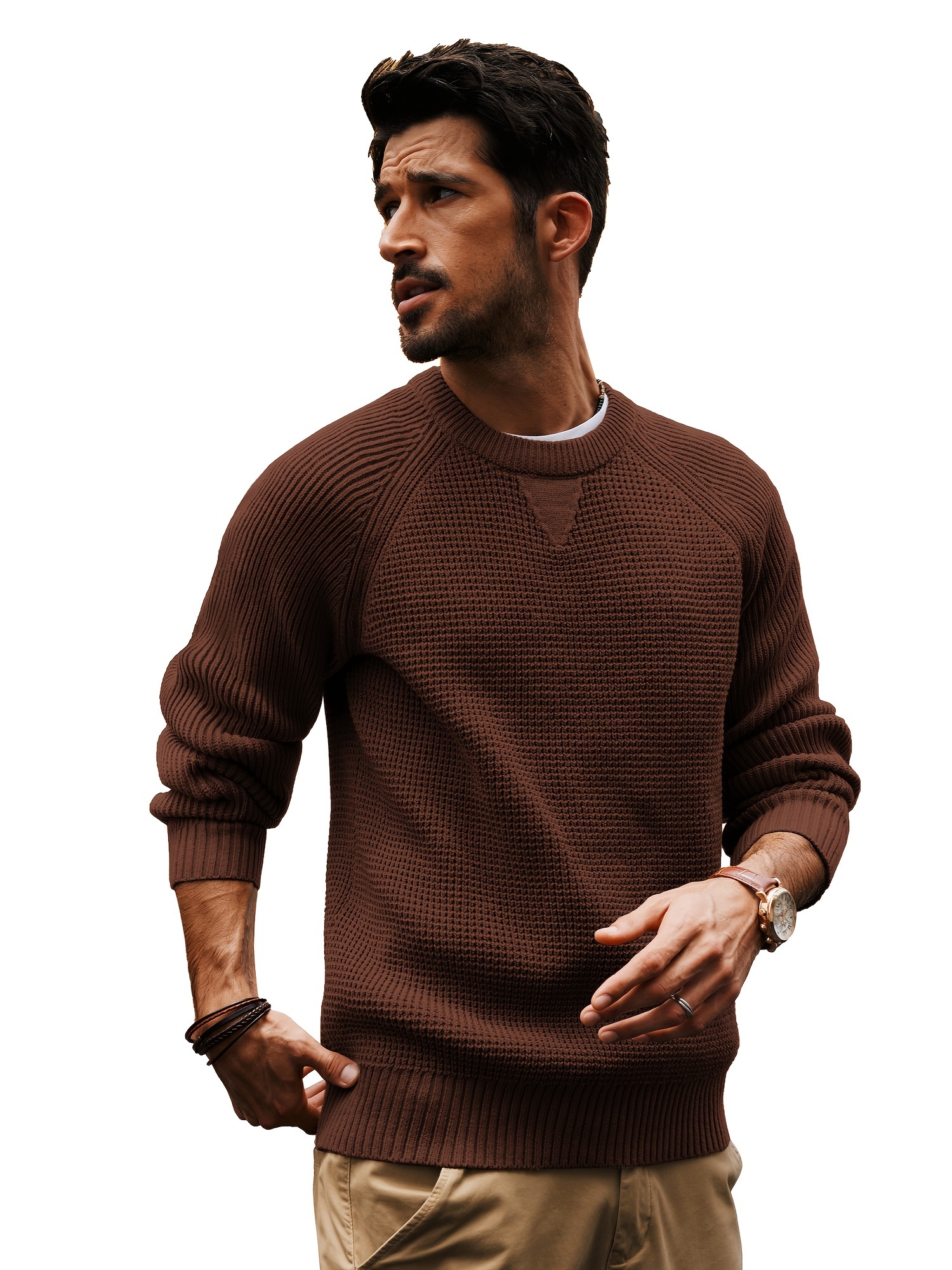 Men Waffle Textured Sweater Long Raglan Sleeve Crew Neck Ribbed Cuff Pullover