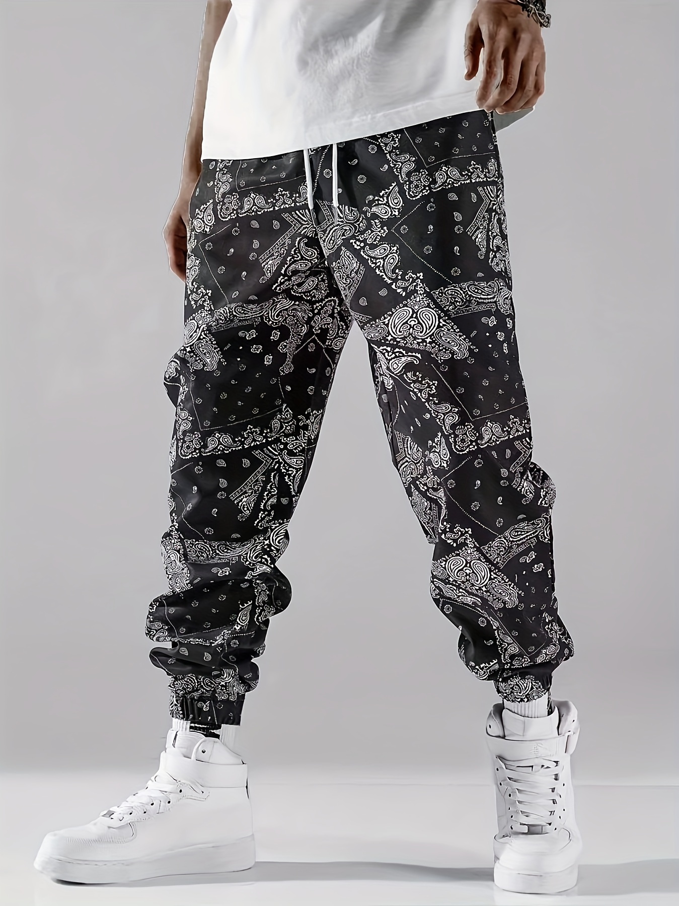 Stylish Paisley Print, Men's Casual Cuffed Pants, Breathable Lightweight Comfy Drawstring Pants